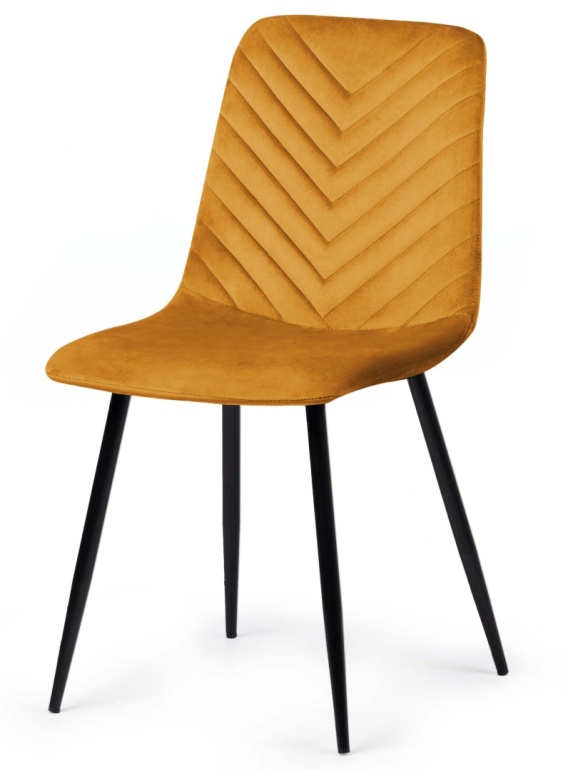 Nowoczesne, solidne i wygodne krzesło do salonu, kuchni, jadalni. Tapicerowane miodową pikowaną tkaniną typu welur. Czarne metalowe nogi.